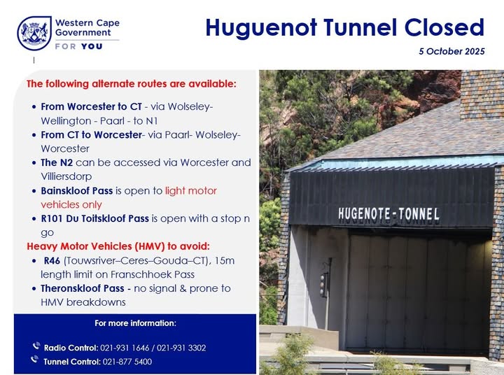 Drakenstein WebSite Press Releases Huguenot Tunnel remains closed08 October 2025 | Press Releases05 October 2025No definitive timeline is available for when the Huguenot Tunnel will be reopened following last Friday’s bus fire.The South African National Roads Agency (Sanral) is working around the clock to restore the tunnel to a safe operational condition. Motorists are urged to plan accordingly, be patient and allow for additional traveling times as alternative routes are experiencing congestion.For real-time Huguenot Tunnel information, contact 021 877 5400 or the Western Cape Government Traffic Law Enforcement Radio Control at 021 931 1646 or 021 931 3302.END
