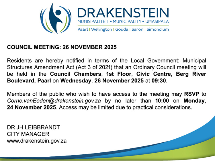 Comments must be submitted in writing to the Drakenstein Municipality, P.O. Box 1, Paarl 7622 or customercare@drakenstein.gov.za by no later than 17 November 2025. No late comments will be considered.